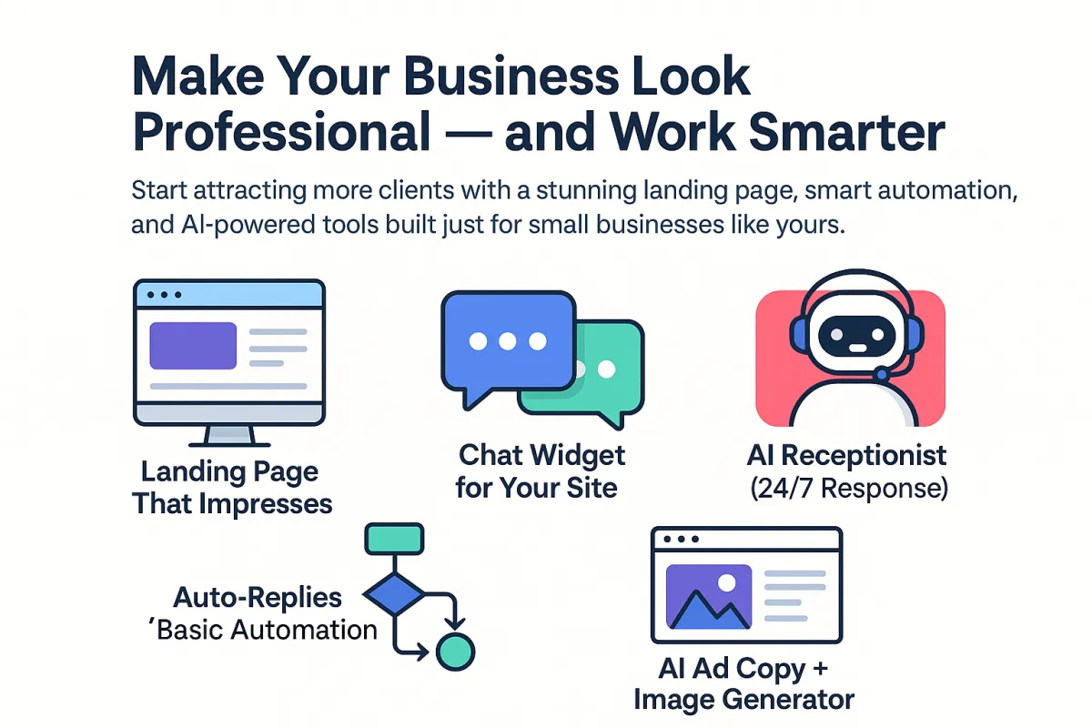 Start attracting more clients with a stunning landing page, smart automation, and AI-powered tools built just for small businesses like yours.